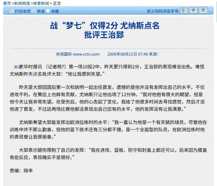 而尤纳斯的解法也很干脆,传统中锋拿球困难在2006年已经不是秘密,那既然如此你就必须在发起进攻上找到新的方向,那对中国队来说这个方向自然就是王治郅……